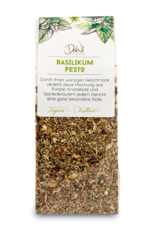 Zutaten: Basilikum, 22 % Pinienkerne, Zwiebeln, Oregano, Knoblauch, Steinsalz, Pfeffer, Paprika, Rosmarin. Zubereitung: Gewürzmischung mit der gleichen Menge Wasser anrühren und kurz quellen lassen, mit Olivenöl verrühren bis die gewünschte Konsistenz erreicht ist.