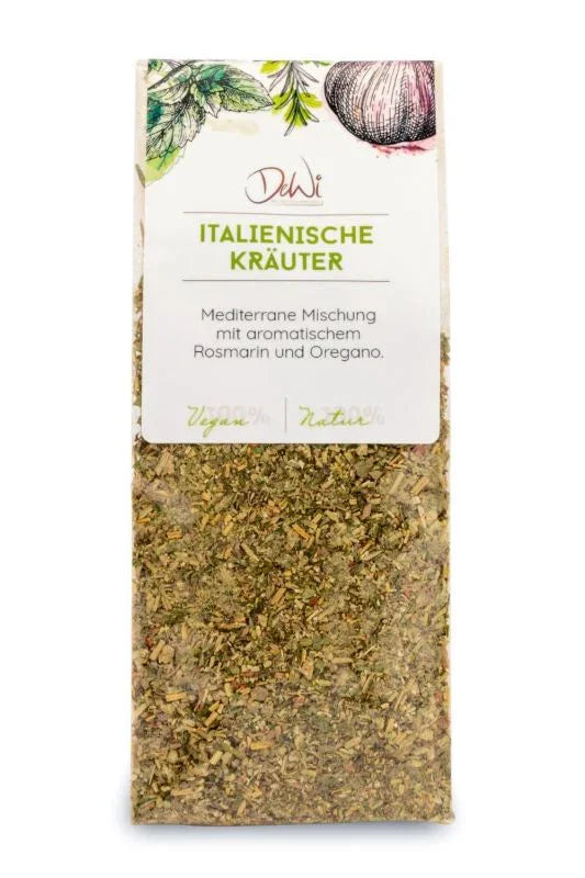 Zutaten: Rosmarin, Oregano, Basilikum, Zwiebel, Petersilie, Thymian, Liebstöckel, Knoblauch, Schnittlauch, Salbei, Pfeffer, Tomaten, Paprika, Zitronenschale, Orangenschale, Majoran, Kerbel, Estragon,kMediterrane Mischung mit viel aromatischem Rosmarin und Oregano.